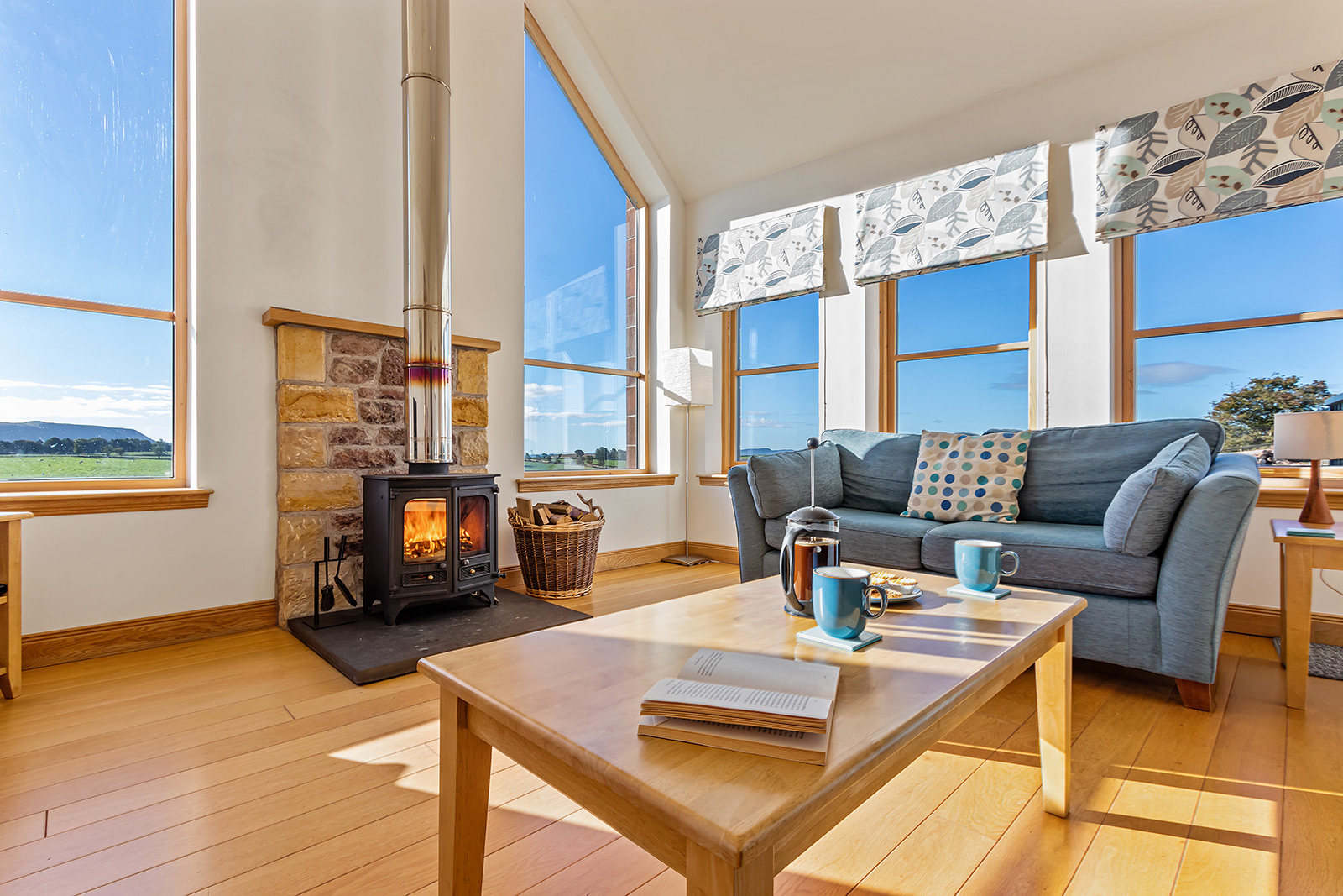 Property is all on ground floor level, heated by ground source heat recovery system and under floor heating throughout and comprises: Lounge: With wood burning stove, Free view TV and DVD, stunning views over open farmland to Lomond Hill from large triangular windows.